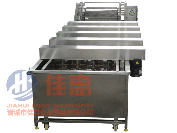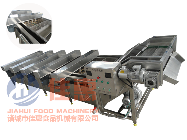 本設(shè)備為氣泡清洗機的改進(jìn)設(shè)備,槽體上方加裝了橡膠攪拌裝置,目的是針對不同的清洗物料達(dá)到不同的清洗效果,特別是對玉螺菜(別稱螺絲菜、寶塔菜)等根須比較發(fā)達(dá)的根莖類蔬菜清洗效果顯著。